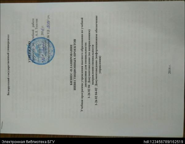 | Заглавие документа: | БИЗНЕС-ПЛАНИРОВАНИЕ ИНВЕСТИЦИОННЫХ ПРОЕКТОВ Учебная программа учреждения высшего образования по учебной дисциплине для специальности: 1-26 02 04 Документоведение (по направлениям) направления специальности 1-26 02 04-02 Документоведение (информационное обеспечение управления) |