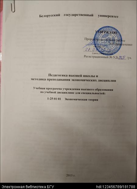 Заглавие документа: | Педагогика высшей школы и методика преподавания экономических дисциплин. Учебная программа для специальности 1-25 01 01 "Экономическая теория" (дневное отделение), № УД-315/уч. |