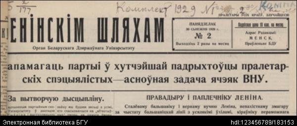| Заглавие документа: | Ленінскім шляхам : Орган Беларускага Дзяржаўнага Унівэрсытэту. - Менск : Друкарня БАН. - 1929, № 2 (панядзелак, 30 снежня). - 3000 экз. |