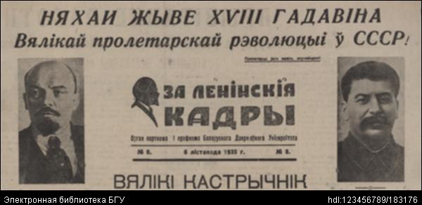 Заглавие документа: За ленінскія кадры : орган парткома і прафкома Беларускага дзяржаўнага універсітэта. - Менск : Друкарня "Звязды". - 1935, №8 (6 лістапада). - 1800 экз.