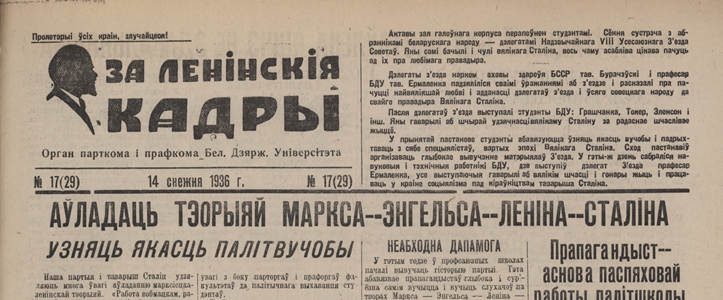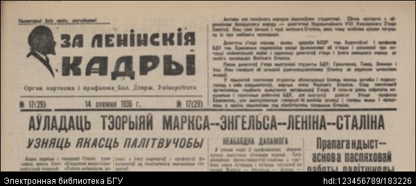 | Заглавие документа: | За ленінскія кадры : орган парткома і прафкома Беларускага дзяржаўнага універсітэта. - Менск : Друкарня "Звязды". - 1936, №17 (29) (14 снежня). - 1000 экз. |
