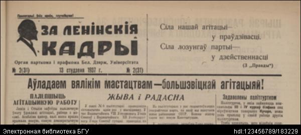 | Заглавие документа: | За ленінскія кадры : орган парткома і прафкома Беларускага дзяржаўнага універсітэта. - Менск : Друкарня "Звязды". - 1937, №2 (31) (13 студзеня). - 1000 экз. |