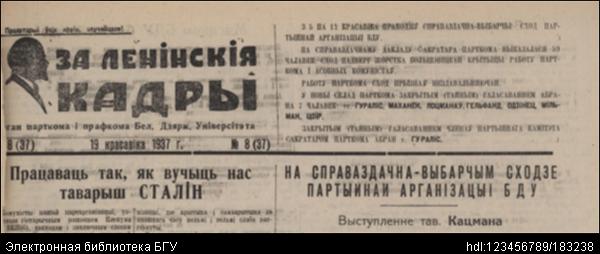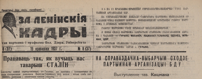 | Title: | За ленінскія кадры : орган парткома і прафкома Беларускага дзяржаўнага універсітэта. - Менск : Друкарня "Звязды". - 1937, №8 (37) (19 красавіка). - 1000 экз. |