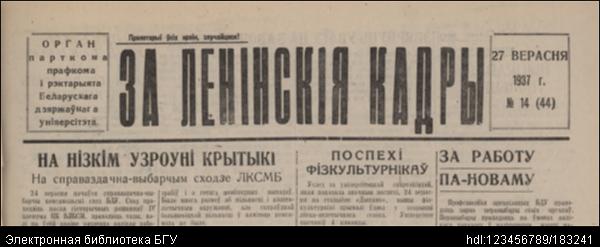 Заглавие документа: За ленінскія кадры : орган парткома, прафкома і рэктарыята Беларускага дзяржаўнага універсітэта. - Менск : Друкарня "Звязды". - 1937, №14 (44) (27 верасня). - 1000 экз.