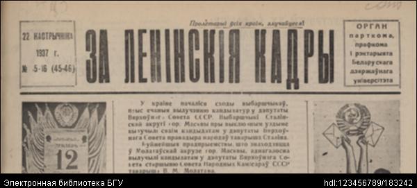| Заглавие документа: | За ленінскія кадры : орган парткома, прафкома і рэктарыята Беларускага дзяржаўнага універсітэта. - Менск : Друкарня "Звязды". - 1937, №15-16 (45-46) (22 кастрычніка). - 1000 экз. |
