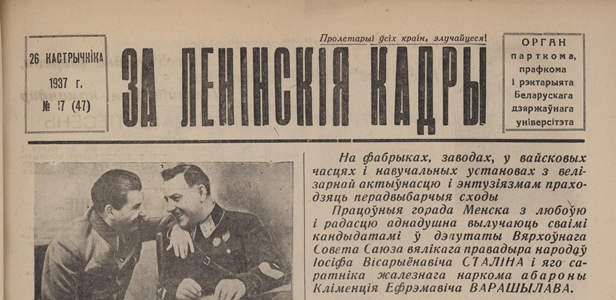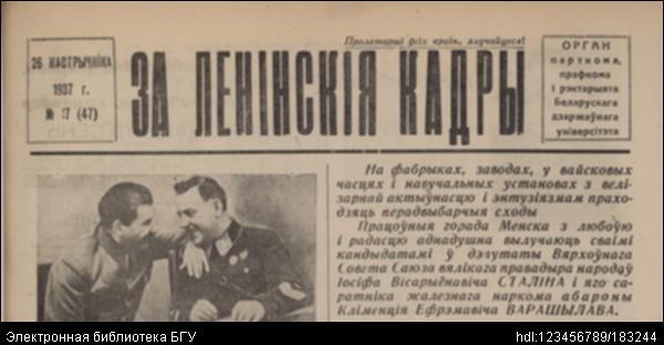 | Заглавие документа: | За ленінскія кадры : орган парткома, прафкома і рэктарыята Беларускага дзяржаўнага універсітэта. - Менск : Друкарня "Звязды". - 1937, №17 (47) (26 кастрычніка). - 1000 экз. |