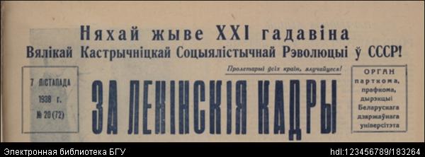 | Заглавие документа: | За ленінскія кадры : орган парткома, прафкома, дырэкцыі Беларускага дзяржаўнага універсітэта. - Менск : Друкарня "Звязды". - 1938, №20 (72) (7 лістапада). - 1500 экз. |