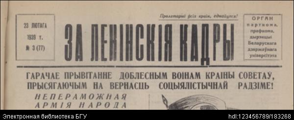 | Title: | За ленінскія кадры : орган парткома, прафкома, дырэкцыі Беларускага дзяржаўнага універсітэта. - Менск : Друкарня "Звязды". - 1939, №3 (77) (23 лютага). - 1500 экз. |