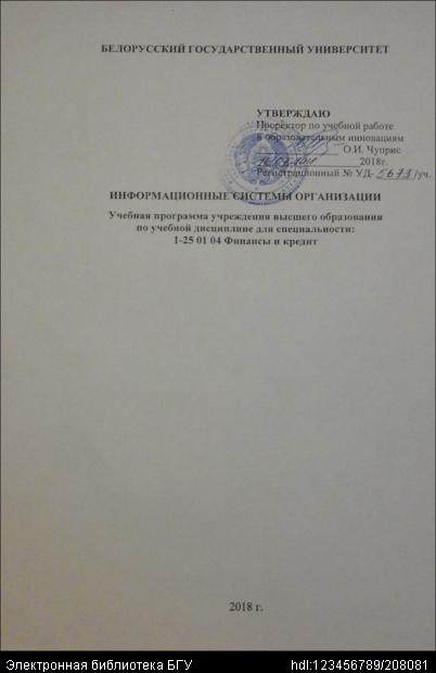 Title: Информационные системы организации. Учебная программа учреждения высшего образования по учебной дисциплине для специальности 1-25 01 04 Финансы и кредит. № УД-5673/уч.