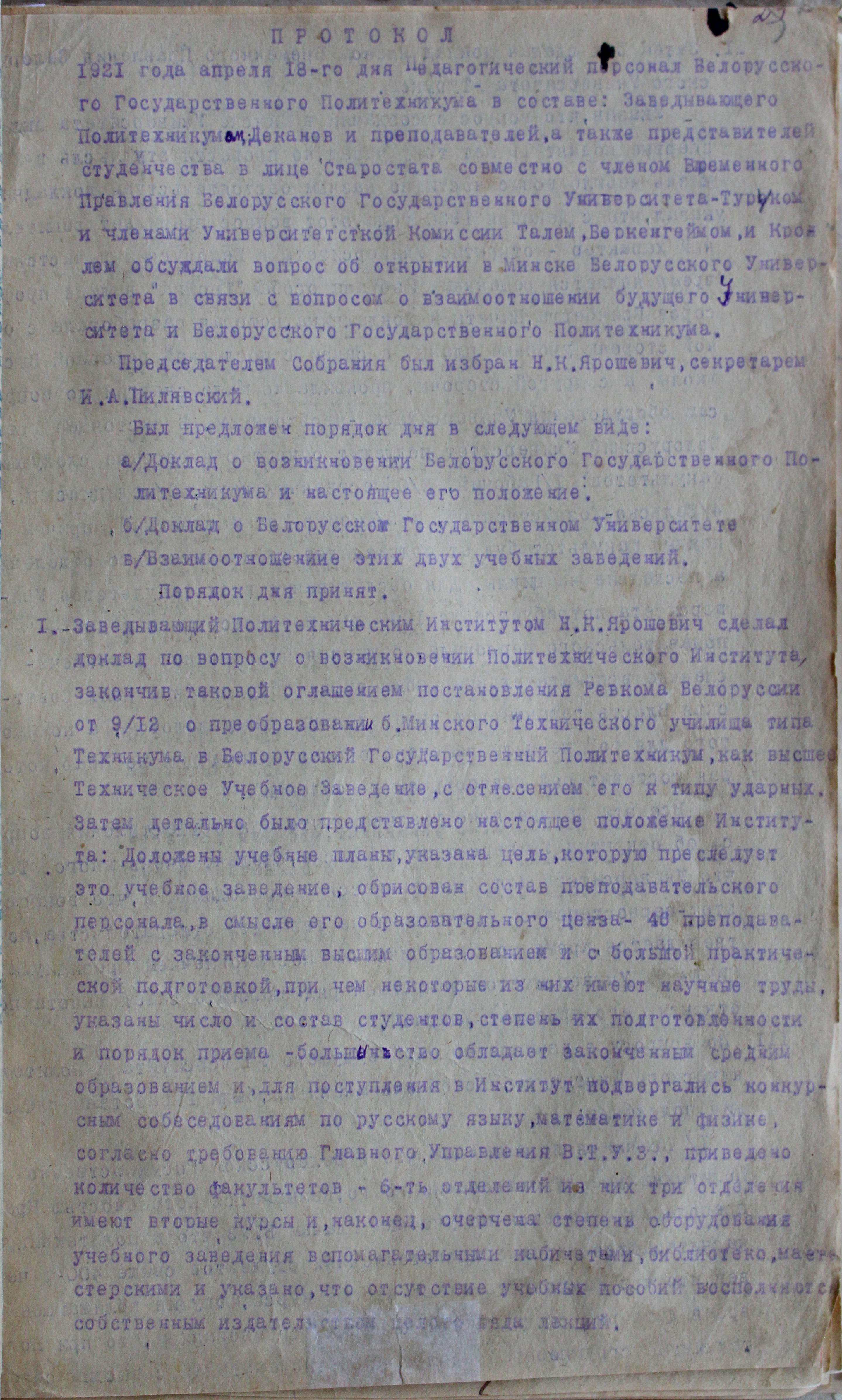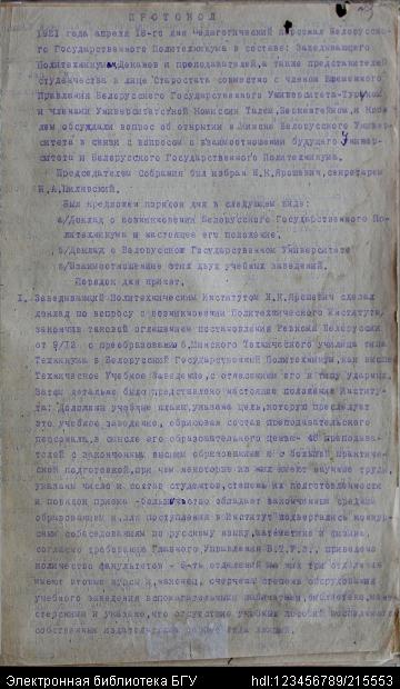 Заглавие документа: | Протокол собрания 18 апреля 1921 г. [о взаимоотношении будущего университета и Белорусского государственного политехникума] |
