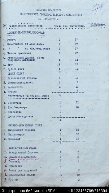 | Заглавие документа: | Штатная ведомость БГУ на 1922-1923 гг. |