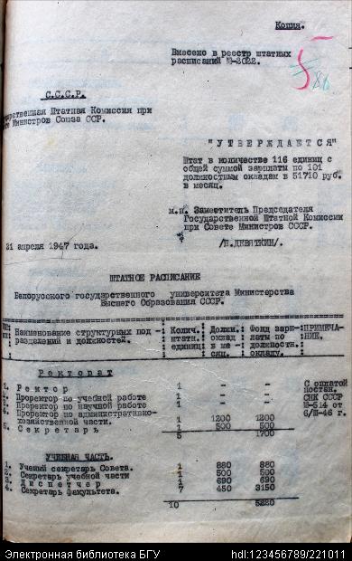 Заглавие документа: Штатное расписание Белорусского государственного университета Министерства высшего образования СССР