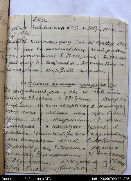 Заглавие документа: | Отчет о работе библиотеки БГУ с ноября 1944 по 1.V.1945 г. |