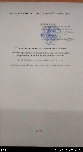 Заглавие документа: | Технологии интеллектуального анализа данных: Учебная программа учреждения высшего образования по учебной дисциплине для специальности: 1-25 80 03 Финансы, налогообложение и кредит, профилизация: Финансовые технологии и банковское дело, № 7547 |