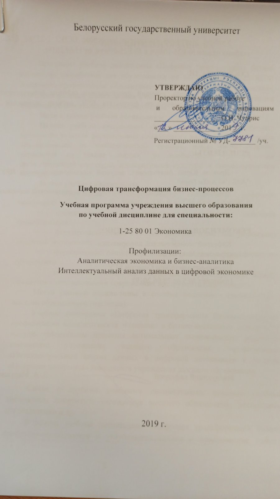 Заглавие документа: | Цифровая трансформация бизнес-процессов: Учебная программа учреждения высшего образования по учебной дисциплине для специальности: 1-25 80 01 Экономика, Профилизации: Аналитическая экономика и бизнес-аналитика, Интеллектуальный анализ данных в цифровой экономике, № УД-7781-уч. |