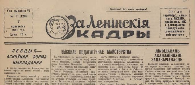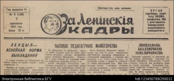 Заглавие документа: За ленінскія кадры : орган партбюро, камітэта ЛКСМБ, прафкома, МК і рэктарыята Беларускага дзяржаўнага універсітэта. - Мінск : Друкарня "Звязды". - 1941, №5 (120) (7 красавіка). - 500 экз.